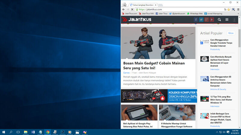 Pada Windows 10 memiliki sebuah fitur Snap atau di Windows 7 dikenal sebagai Aero Snap, di mana kamu bisa menempatkan Windows yang sedang aktif dengan bentuk atas bawah, atau kiri-kanan hanya dengan kombinasi tombol di keyboard.